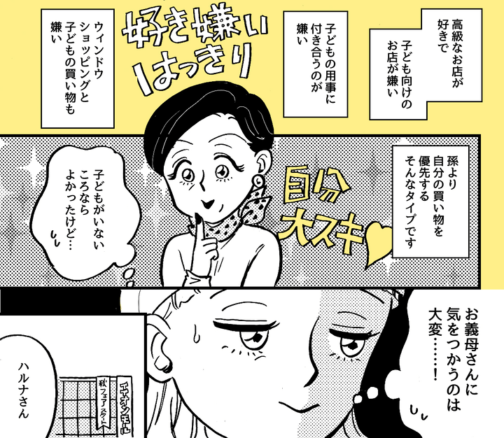 ただ、お義母さんは好き嫌いがはっきりしており、たとえば高級なお店は好きだけど、子ども向けのお店は嫌い。子どもの用事に付き合うのも嫌い。そんなことより自分の買い物が好き……孫よりも自分が好き。そんなタイプです。子どもがいてお義母さんに気をつかうのは本当に大変です。
