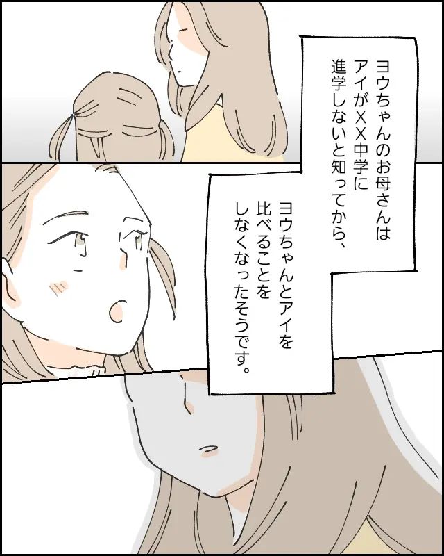 その後、ヨウちゃんのお母さんはアイが××中学に入学しないと知ってから、ヨウちゃんとアイを比べることをしなくなったそうです。