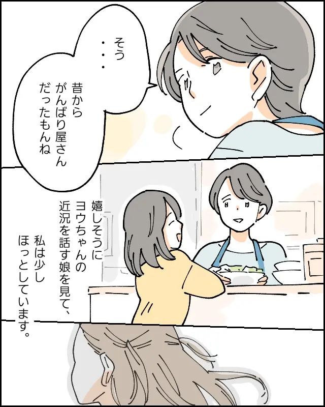 「そう・・昔からがんばり屋さんだったもんね」そう答えた私は、嬉しそうにヨウちゃんの近況を話す娘を見て少しほっとしていました。