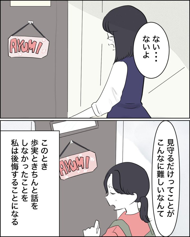 そして、私から目を逸らし「ない・・ないよ」とだけ言って、歩実は自分の部屋に行ってしまいました。すぐに歩実の部屋のドアの前まで行った私ですが、今これ以上追及するのは良くないと思いグッと我慢。見守るだけってことがこんなに難しいなんて・・。しかし、このとき歩実ときちんと話をしなかったことを私は後悔することになります。