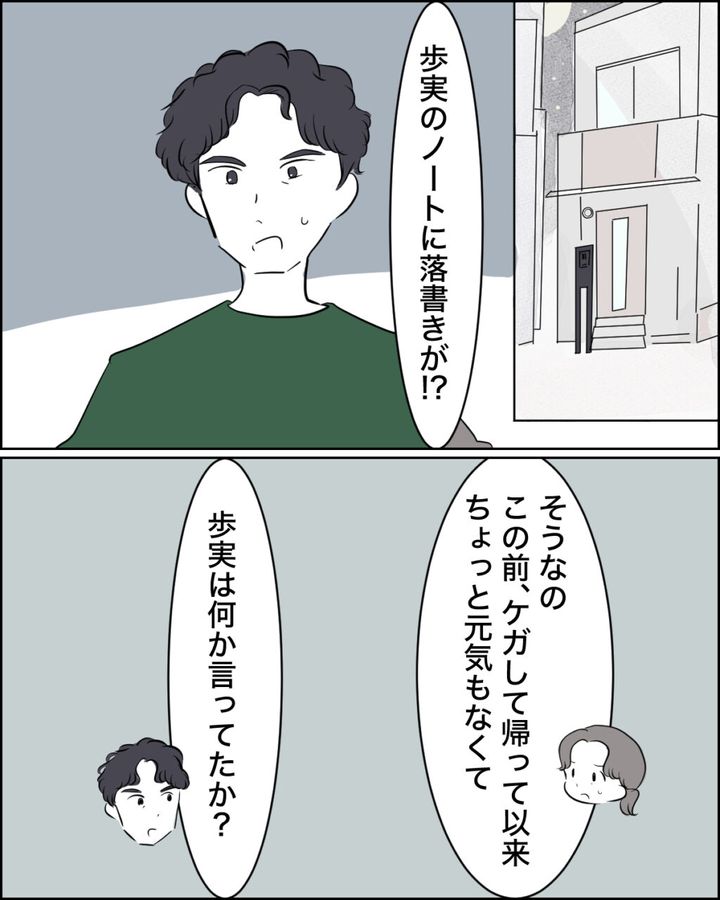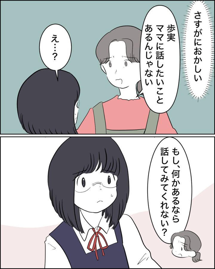見守ると決めていた私ですが、ここまでアクシデントが重なるのはさすがにおかしいと思い「歩実、ママに話したいことあるんじゃない?」と聞かずにはいられませんでした。「もし何かあるなら話してみてくれない?」と迫る私に、歩実は困惑の表情を浮かべてだんまり。