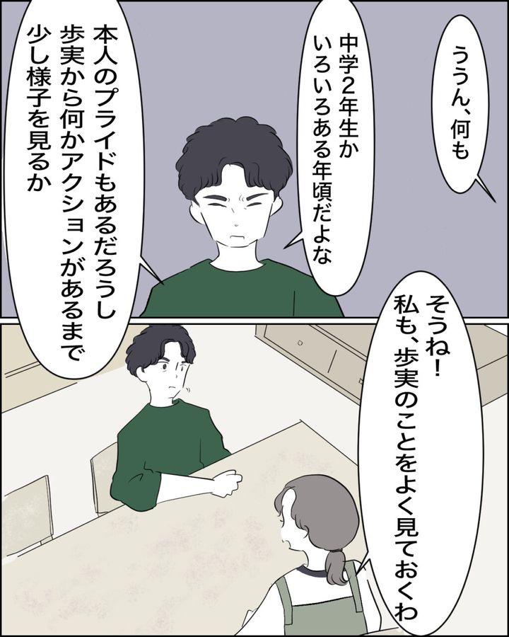 歩実からは何も言ってこないことを話すと、夫は「中学2年生か。いろいろある年頃だよな。本人のプライドもあるだろうし、歩実から何かアクションがあるまで少し様子を見るか」と難しい顔で言いました。私も夫の意見に同感だったため「私も歩実のことをよく見ておくわ」と言って、しばらくは私たちからは何も言わず見守ることにしました。