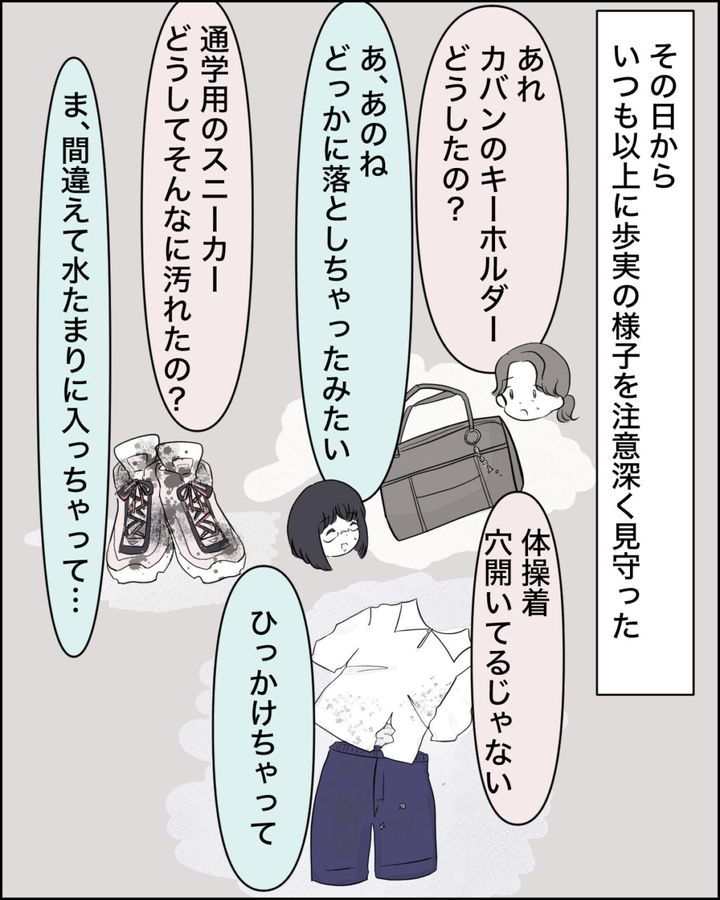 その日から、私は今まで以上に歩実の様子を注意深く見守りました。すると、カバンのキーホルダーがなくなっていたり、通学用のスニーカーがやけに汚れていたり、体操服に穴が開いていたりしていることに気づきました。しかし、歩実に理由を聞いても「落としちゃったみたい」「間違えて水たまりに入っちゃって」「ひっかけちゃって」とはぐらかします。