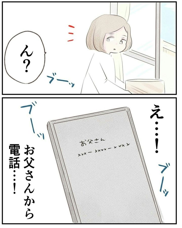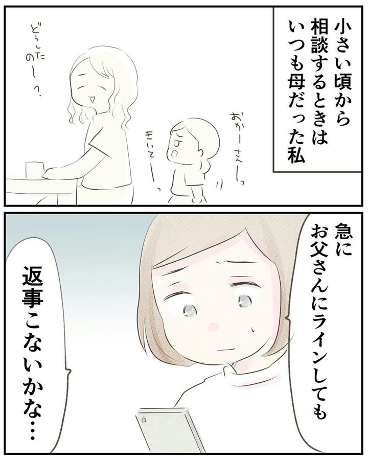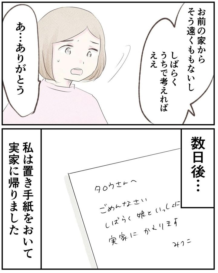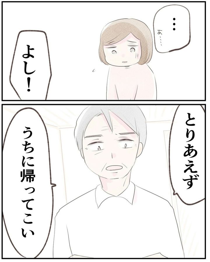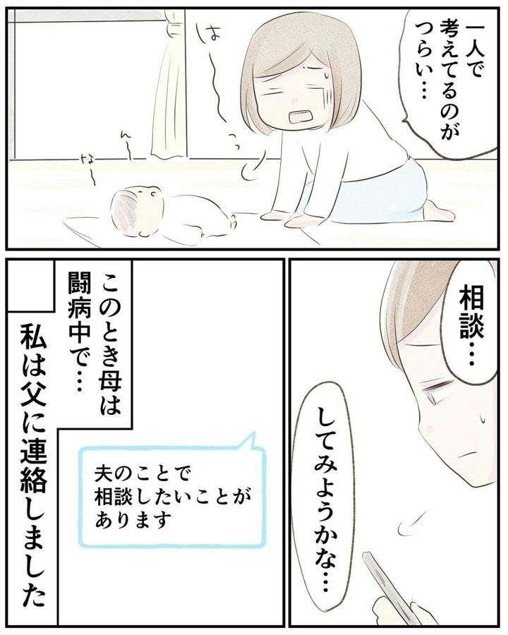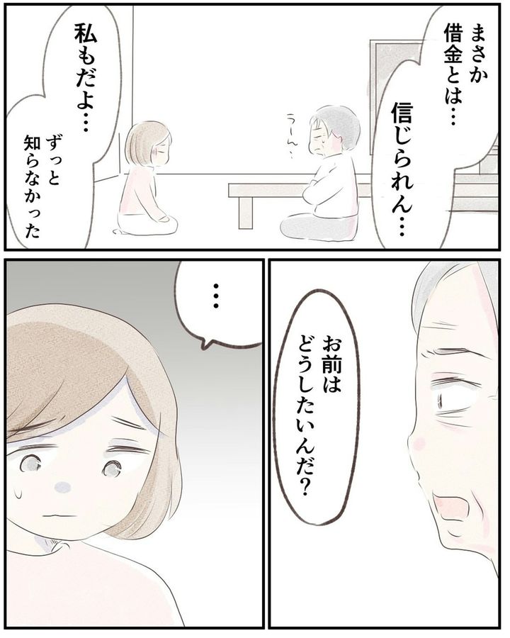 娘からのSOSにすぐ電話をくれた父、とても頼もしいですね。みつこさんは、父親に夫の借金について相談し、どうしたいか聞かれます。しばらく、実家で過ごすことになりました。