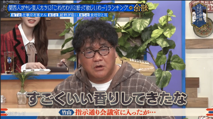 竹山が「入ってどうすんの?誰にキレんの?」と尋ねると、ディレクターは「一番奥に社長がいますから、そいつにめちゃくちゃキレてください」。さらに竹山が「キレると何が起こるの?」と聞くと、ディレクターは照明の色がふわっと変わって気持ちが落ち着くので、「そこはお芝居とかいらないです」。さらにキレる感情を抑えるアロマが出て、「最後はすごいいい香りがしてきて、気持ちが穏やかになります。だから本気で行ってください。本気でブチ切れていいです」と言ったという。