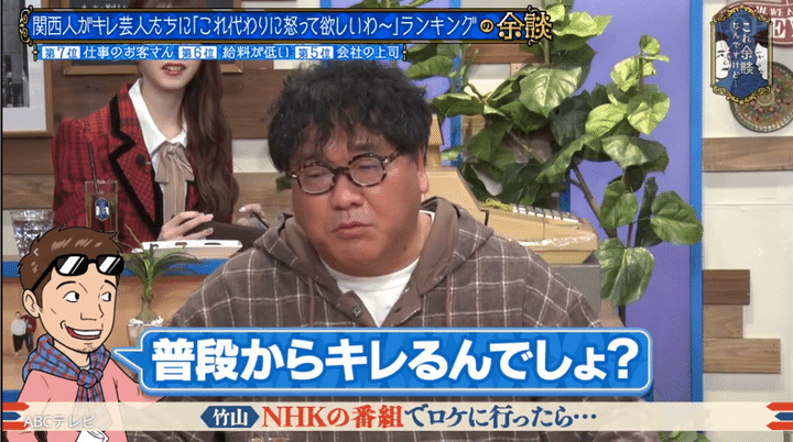 ある日、NHKの仕事で渋谷の会社をロケすることになった竹山。初めて一緒に仕事するディレクターは会うなり、「今日はキレてないですね」「いつも普段からキレるんでしょ?」と言ってきて、竹山はムスッとして、何のロケなのかを聞いたという。