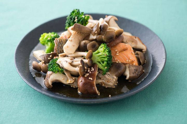 ❷鮭は塩小さじ⅕(分量外)を振って焼き、一口大に切る。ブロッコリーは小房に分けてラップで包み、電子レンジ(600W)で1分加熱する。