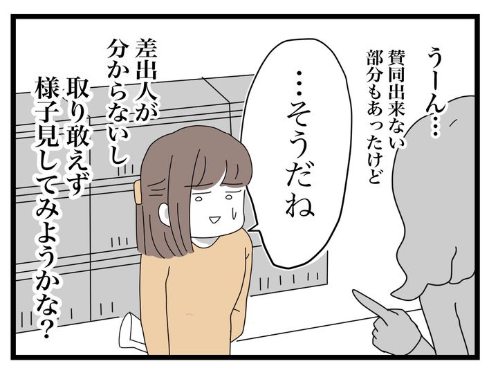 苦手な隣人、トナリに圧をかけられて事情を話すことに。すると「差出人不明なら悩んでも意味ない、苦情ってどうせ子どものことでしょ?」と言われてしまい…。