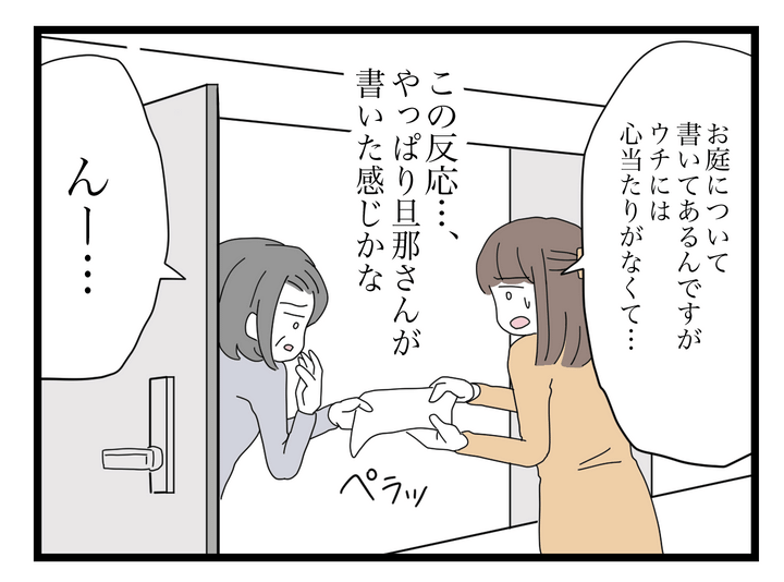 手紙を見た奥さんは心当たりがないようで、やはり強面の旦那さんが書いたものなのかと思ったのですが、はっきり「うちじゃない」と答えた奥さん。