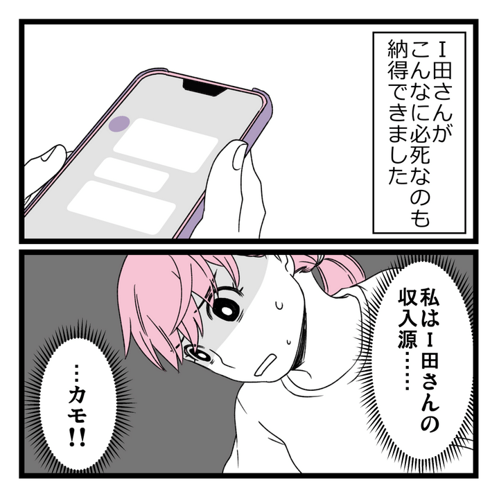 I田さんが必死だったのは、私がI田さんの収入源だったからで、カモをその気にさせるのに必死になるのも納得できました。