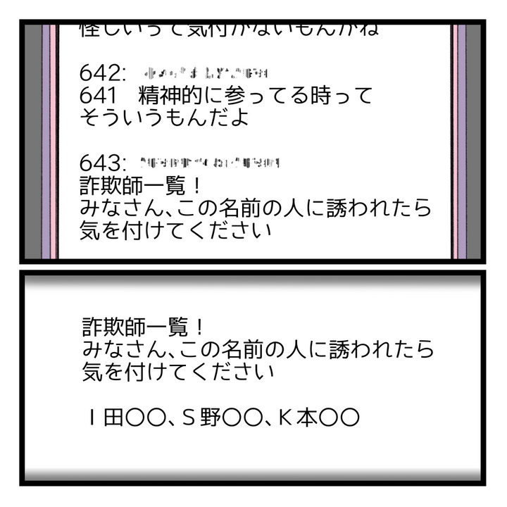 詐欺師一覧と複数の名前が並ぶ中「まさか」と思い、名前を見てみるとI田さん、S野さん、K本さんの名前を見つけました。