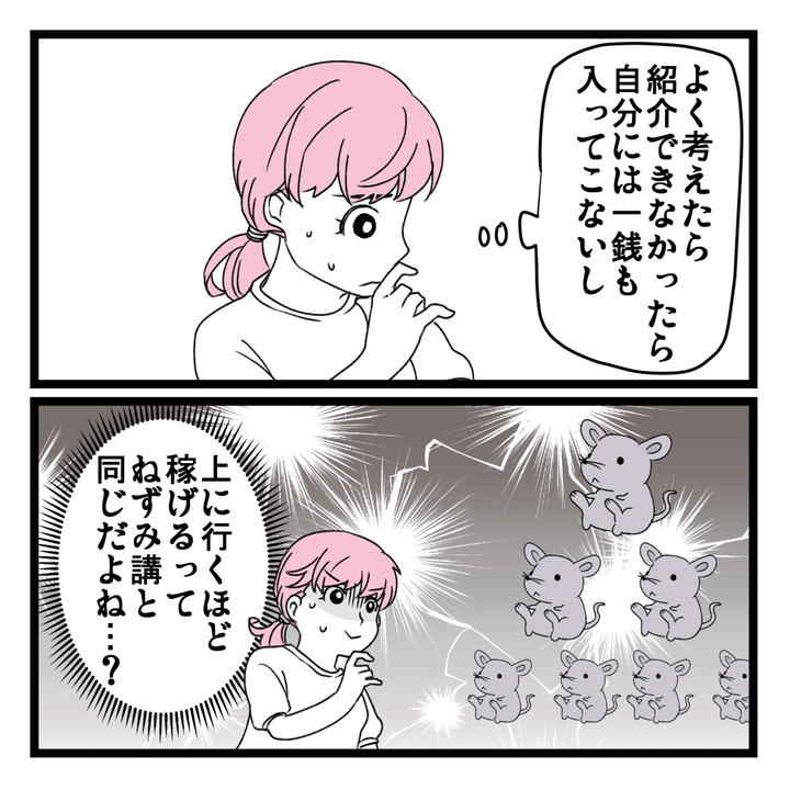 I田さんとのやり取りを振り返ったり、面談での話を思い出すと、ねずみ講と変わらない気がしました。私がビジネスに参加しても誰かを紹介しないと報酬は得られないわけで…。