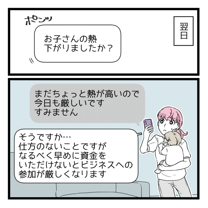 子どもの発熱によって期限内に資金を支払えなかったいろだが、なんとか猶予をもらえて一安心。そんな中、いろが本当に稼げるのか不安だと話すと、I田は「ビジネスに参加しそうな人を見分けるポイントがある」といい…。