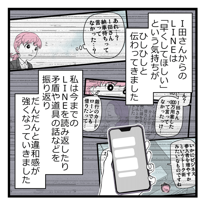 当初は「誰にでもできるビジネスではない」「選ばれた人しかできない」などと少数精鋭みたいなことを言っていたI田さんでしたが、今の話を聞くとお金さえ用意できれば誰でも参加できるような違和感を覚えました。