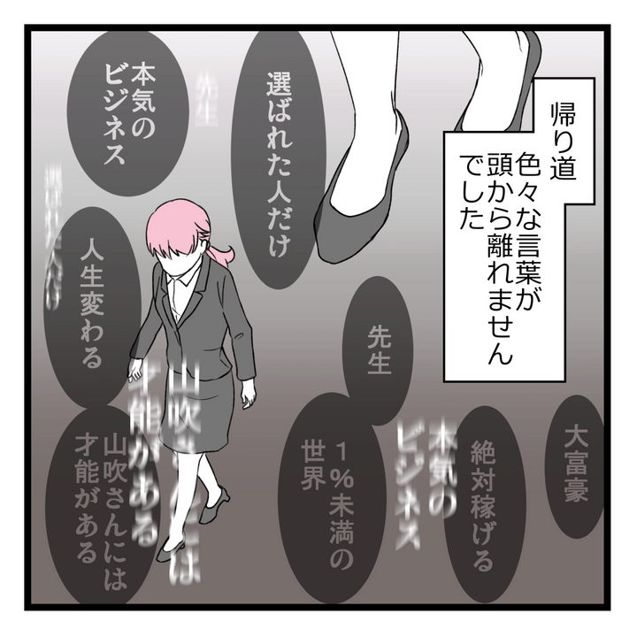 私は謎の自信に満ち溢れていました。何の取り柄もない主婦だけど、自分にはもしかしたら特別な才能があるのかもしれない、と思いました。このビジネスを始めることができたら、私は成功する気しかしない、絶対に合格したい…! 彼女たちが言う「先生」に稼ぐ術を習いたい。