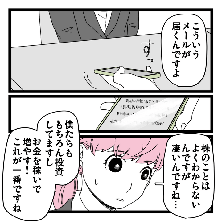 株のエキスパートがいてメールが届くらしく、株の知識がなくても指示された株を買えば儲かる可能性があるそうです。
