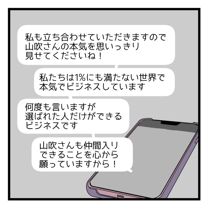 300万円の初期費用を、上司に頼んで200万円にしてもらったというI田。「選ばれた人にしかできないビジネス」と何度も言われ、「その中に入りたい」と思うようになった主人公・いろは、面談のためにスーツまで新調したのでした。