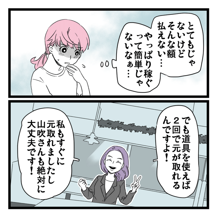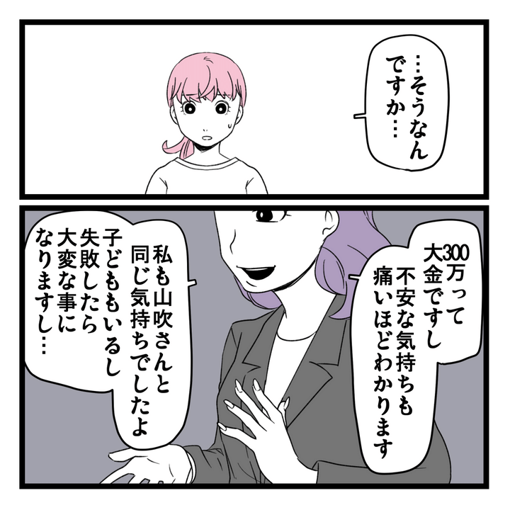 しかしI田さんに「私なら大丈夫」とか「サポートをする」と言われると、ビジネスの内容が気になってしまい、もしかしたら私にも稼げるのでは…?という気持ちが芽生えてきてしまいました。