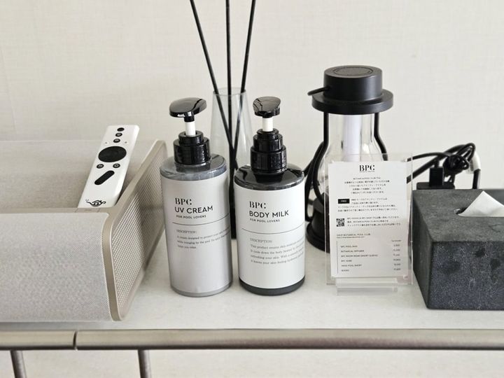 UVクリームやボディミルクなど、客室内にはアメニティを用意。「BPC」オリジナルの、シックかつラグジュアリーな香りつき。