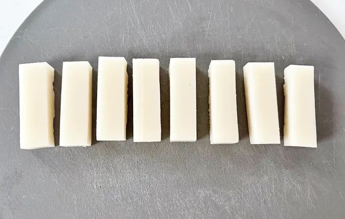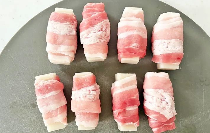 切った餅に、豚バラ肉をくるくると巻きつけていきましょう。