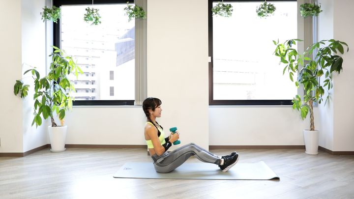 1.ダンベルを両手で持ち、体育座で上体を少し下げた状態にする