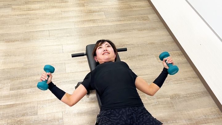 動画では片方3kgのダンベルを使っています。トレーニングベンチの代わりには、ベッドを使うのがおすすめです。