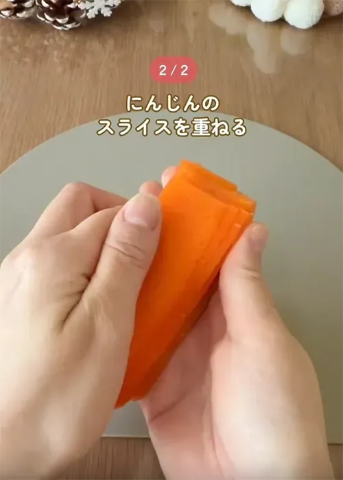 ニンジンを1枚めくり、内側をくるんと丸めて差し込んでください。