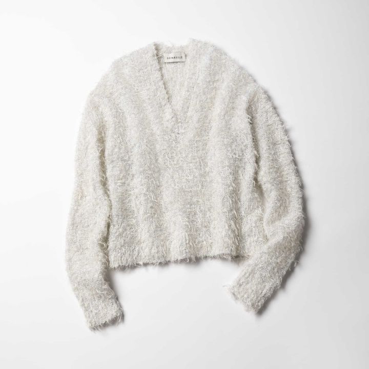 落ち着いた色合いが増える冬の街でひときわ映えるのが白ニット、こちらの1枚は控えめなラメ入りで上品な輝きが唯一無二!V字開きなので、インにシアータートルを合わせたりTシャツを入れてカジュアルダウンしたり、いろいろな着方が楽しめます。シンプルなパンツに合わせてキレイめに着ればパーティ仕様に、デニムでカジュアルダウンするのも可愛く決まるのでオススメです!