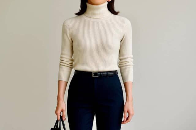 すっきり見せたい日は、縦のラインを意識するのが正解。細リブニットやタートルなら視線が自然と上に向き、重心が上がります。