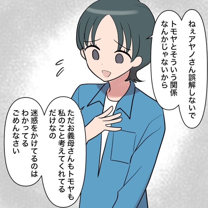 すると、キョウカさんが「ねぇアヤノさん、誤解しないで。トモヤとそういう関係なんかじゃないから。ただ、お義母さんもトモヤも私のこと考えてくれてるだけなの。迷惑をかけてるのはわかってる。ごめんなさい」と申し訳なさそうに謝ってきました。