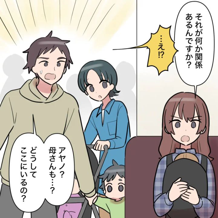 訳の分からない理由を並べて離婚を迫る義母に「それが何か関係あるんですか?」と応戦していると、トモヤがキョウカさん、ソウくん、ルナちゃんと一緒にお店に入って来ました。私と義母の姿を見て「アヤノ?母さんも・・?どうしてここにいるの?」と驚くトモヤ。