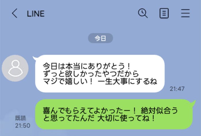 「今日は本当にありがとう! ずっと欲しかったやつだからマジで嬉しい! 一生大事にするね」