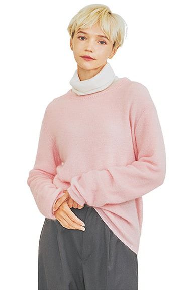 スエット感覚で着られる、丸首&プルオーバータイプで、ひかえめな甘さに着地。起毛感のある白を仕込み、しなやかな印象もキープ。