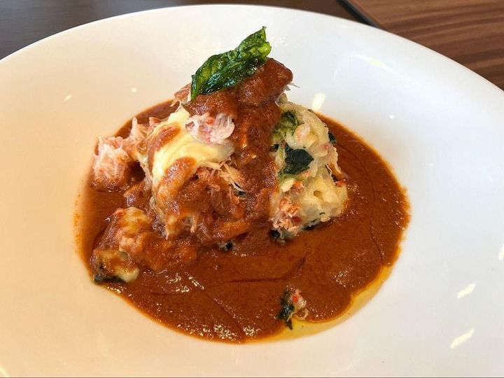 「ズワイガニのラザニア」はカニの身がたっぷり。ソースにもカニみそが使われていて、一口でカニを濃厚に感じます。