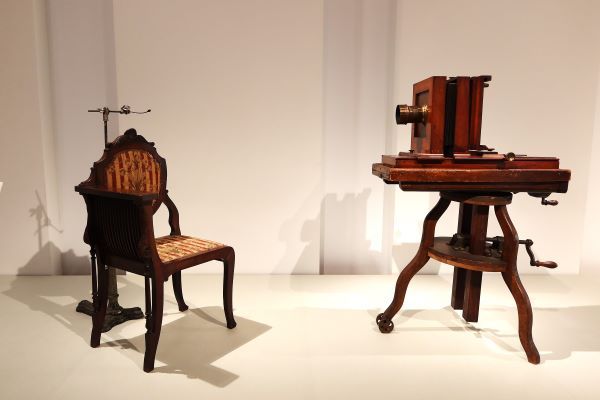 右、《八切判スタジオカメラ》 慶応元年(1865)頃、左、《首押さえ》 明治時代(19世紀)、《椅子》 明治時代(19世紀~20世紀) すべて日本カメラ博物館蔵[/caption]