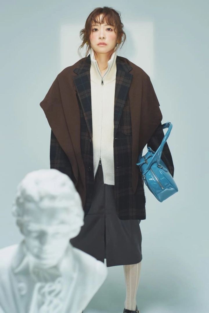 チェックジャケット 44,000円/マチュアリー(レイ ビームス 新宿)ハイネックニット 3,960円/AUNTIE ROSA HOLIDAY.( アンティローザ )レザースカート 7,990円/MANGO ニットスカーフ 1,990円/GU イヤリング 8,640円/アビステ バッグ 7,590円/カシュカシュ(アンビリオン)タイツ 1,650円/靴下屋(Tabio)メリージェーン 10,890円/RANDA