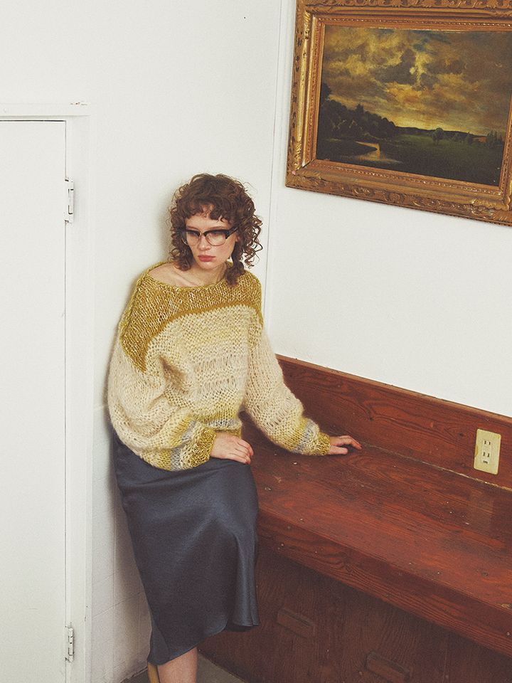 ファーに近い華やかさがあるシャギーニットは、くすんだ色みを選びひかえめな甘さに調整。デニムと合わせた鉄板スタイルを、地味でも派手でもない絶妙な存在感に。バックオープンデザインで、後ろ姿はセンシュアルなムード。あどけなさと大人っぽさを1枚で表現できるから、デニムでくずしてもほどよいあんばいに仕上がる。