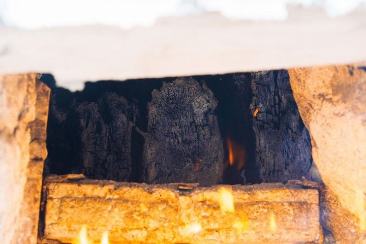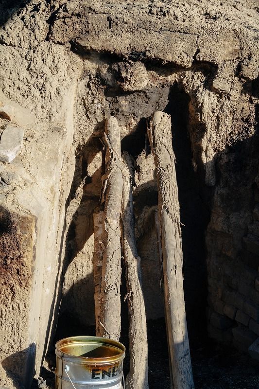 並べ終わったら窯の入り口を閉じ、火を焚き、薪をくべていきます。