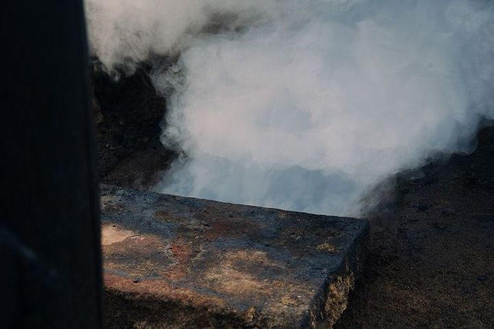 窯場にお邪魔すると、一層炭火の香りが強くなり、パチパチと火を炊く音が聞こえ、釜から煙がモクモクと上がっています。