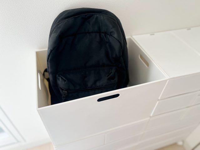 バスケットは一番上に置いてカバンの定位置に。帰宅したらまずここに置く!と決めておくだけで、スムーズな動線になりますし、床置きしないことで部屋もすっきりします。