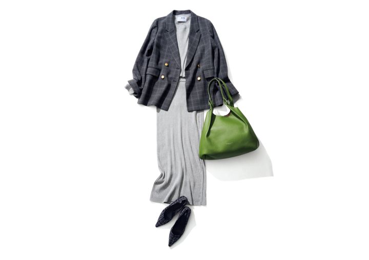 ジャケット¥17,990/ANYSIS(オンワード樫山) ニット¥22,000、スカート¥26,400/ともにスリードッツ(スリードッツ表参道店) トートバッグ¥75,900/ジャンニ キアリーニ(ジャンニ キアリーニ 銀座店) ツイードパンプス¥6,590/ZARA(ザラ)