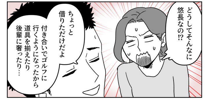 夫の悠長な様子に腹が立ってきました。聞くと、ゴルフ道具を買ったり後輩に奢ったりするために「ちょっと借りただけ」と言います……。
