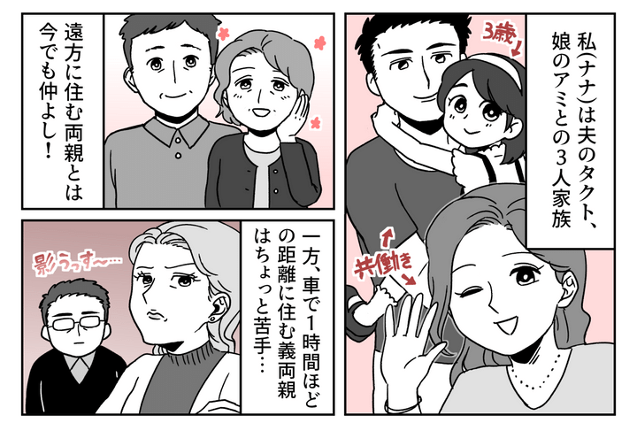 私(ナナ、30代)は3歳の娘(アミ)の母。夫(タクト、30代)との共働きです。私の両親は遠方に住んでいますが、母とはよく電話で話しています。義実家は車で1時間ほどの場所にあり、義両親ともに健在です。義母はかなり気が強く、義父も夫も義母の言いなりと言っても過言ではありません。私は義母が苦手ですが、夫や娘にとっては大事な家族なので、疎遠にはしていません。