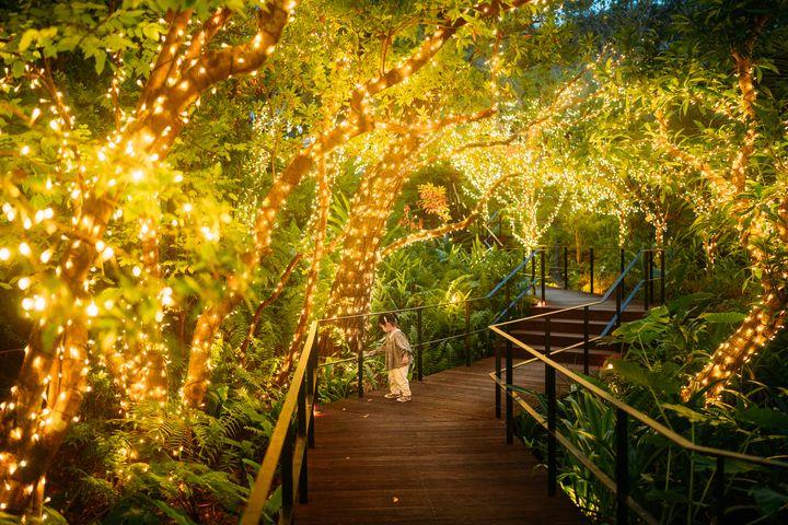 ロビーとスパを繫ぐ“やんばるの森”も幻想的にライトアップ。自然保護のために浮かせて作ったデッキを歩き、ロマンティックな南国の時間を過ごしましょう。