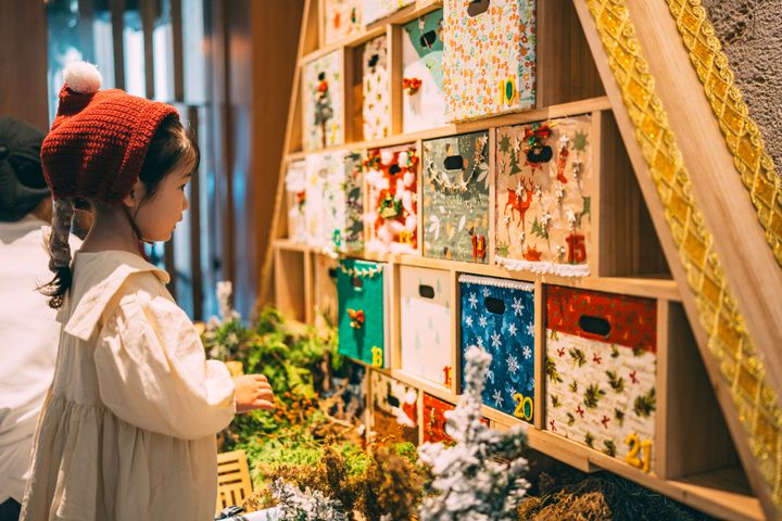 ロビーには、大きなツリー型のアドベントカレンダーが登場。ボックスの中には、サンタクロースから子どもたちへの贈りものが入っています。