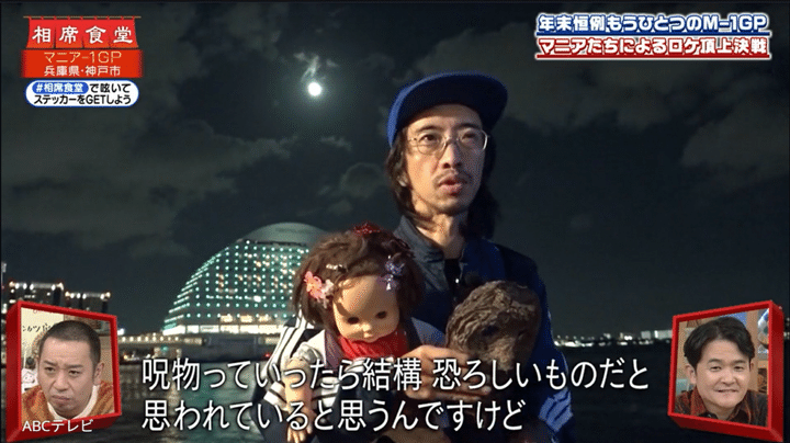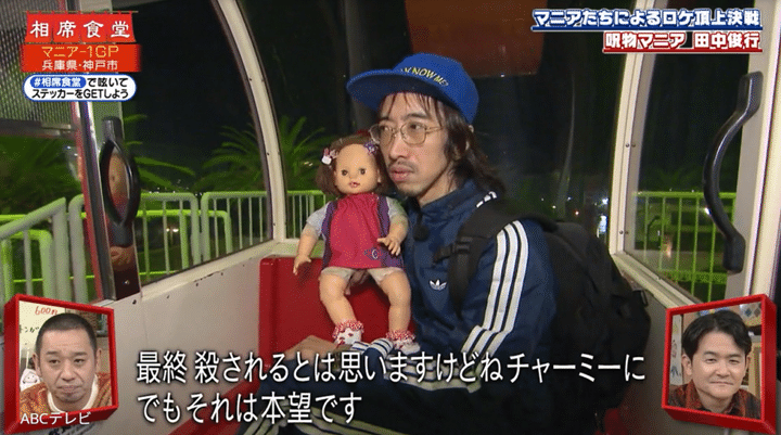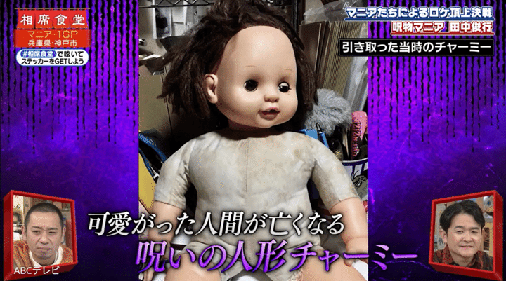 田中氏が兵庫県神戸市での街ブラロケに連れてきたのは、“かわいがると死ぬ呪いの人形”チャーミーだ。彼いわくチャーミーは、「ある介護施設にいつからかいた」「その介護施設で5人殺している」「かわいがった人は3日以内に死んでいく」という。