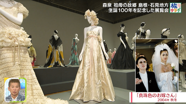 数々の華やかなドレスの中には、森英恵さんの最後のショーで森泉が着用した、着物の布地を使ったウエディングドレスが! 森泉は、「結婚したらこれ着るって言っていたんですけど、まだちょっと結婚式をやってない……」と笑いつつ、「(この展示を)ママ森と一緒に見たかったな」としみじみ語った。