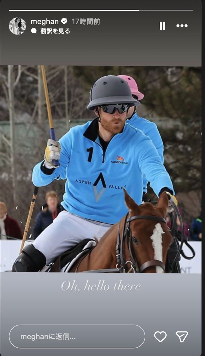 王子にとっては、久しぶりに親友と大好きなスポーツを楽しむ機会になったスノーポロ。聞きなれない名前だが、文字通り雪の中でするポロである。メーガン妃は雪を背景に馬に乗る王子の写真をインスタグラムのストーリーに投稿。「そこのあなた、こんにちは」と、王子に呼びかけるようなコメントを書き添えている。
