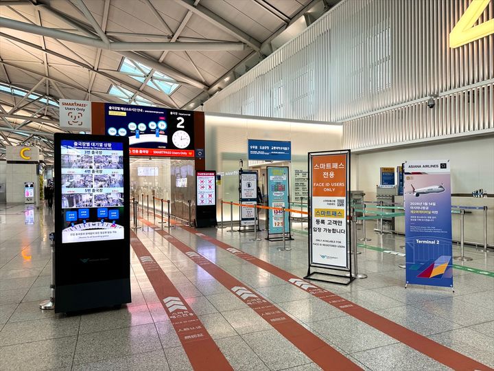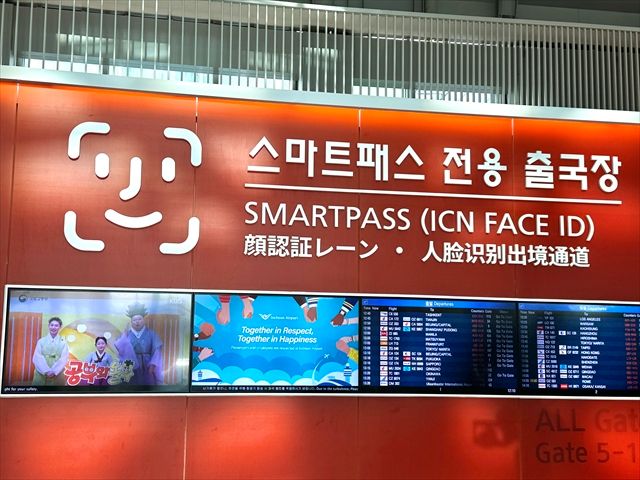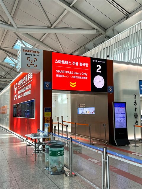 仁川国際空港の出発ロビー(保安検査前)や、一部の搭乗ゲートで「スマートパス専用レーン」が使え、顔認証だけで手続きが完了します。