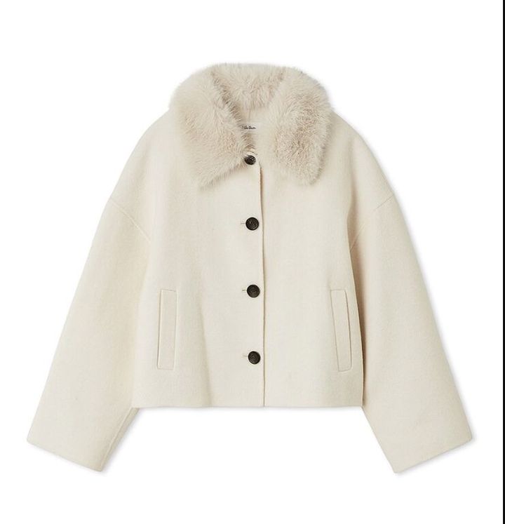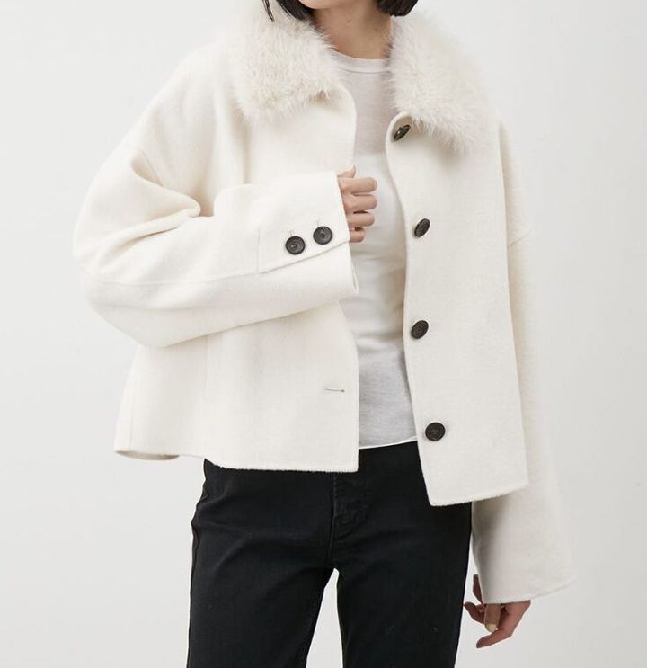 まずご紹介するのは、顔周りにリッチな華やかさを添えるショートコートです。